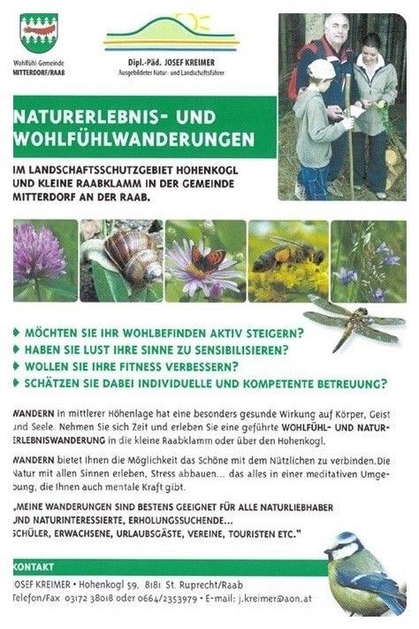 Die kleine Raabklamm gehört noch zu den letzten noch erhaltenen Flusstrecken Österreichs. Leicht begehbare Wege, eine mannigfaltiger Tier- und Pflanzenwelt und eine geradezu idylische Atmosphäre lassen den Alltagstress vergessen und machen diesen Abschnitt der Raabklamm zu einem einmaligen Erholungsgebiet für Jung und Alt.
